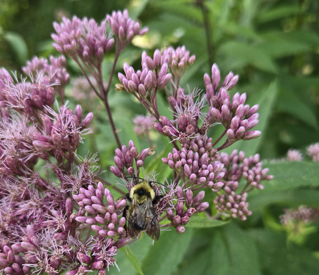 Rusty patched bumble bees, a federally endangered species, forage on a wide range of native flowers but show strong preference for wild bergamot (bee balm), Joe-Pye weed and prairie clover. Other native bees rely on golden alexander, blue vervain and sunflowers, which offer accessible pollen and nectar at key times of the season. Early spring bees depend on woodland wildflowers like bloodroot and wild geranium, while late-season pollinators turn to blazing star and sneezeweed.